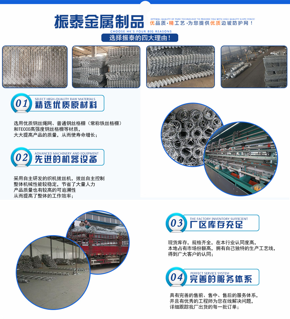 深州市振泰金屬制品有限公司緊鄰絲網(wǎng)之鄉(xiāng)—安平,東距(G45)大廣高速10公里,南距(G1811)石黃高速15公里,北距首都北京250公里,京九鐵路從這里鋪地而過(guò),交通十分便利,河北省深州市231省道90公里處(深州市與安平縣交界處南150米路東),是一家集生產(chǎn),加工,銷(xiāo)售為一體的專(zhuān)業(yè)防護(hù)網(wǎng)廠(chǎng)家。 我廠(chǎng)經(jīng)過(guò)多年的研究創(chuàng)新,產(chǎn)品不斷推陳出新,堅(jiān)持技術(shù)創(chuàng)新、科學(xué)管理、誠(chéng)信經(jīng)營(yíng),注重引進(jìn)先進(jìn)的生產(chǎn)技術(shù)設(shè)備,推行標(biāo)準(zhǔn)化生產(chǎn),從原材料采購(gòu)、生產(chǎn)管理、產(chǎn)品檢測(cè)等關(guān)鍵環(huán)節(jié)嚴(yán)格把關(guān),確保了產(chǎn)品質(zhì)量,贏(yíng)得了客戶(hù)的信賴(lài)。